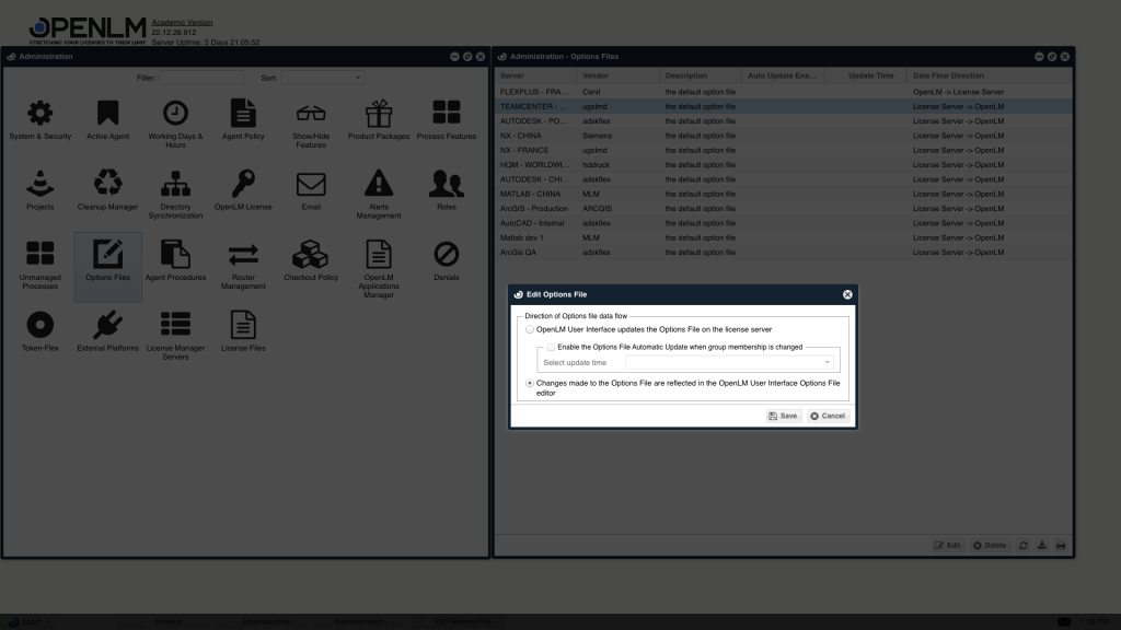OpenLMを使用してオプションファイルを構成すると、構成データは OpenLM Serverに表示され、ライセンスサーバーのマシン上のOpenLM Brokerに転送されます。OpenLM Brokerはオリジナルのオプションファイルを更新します。