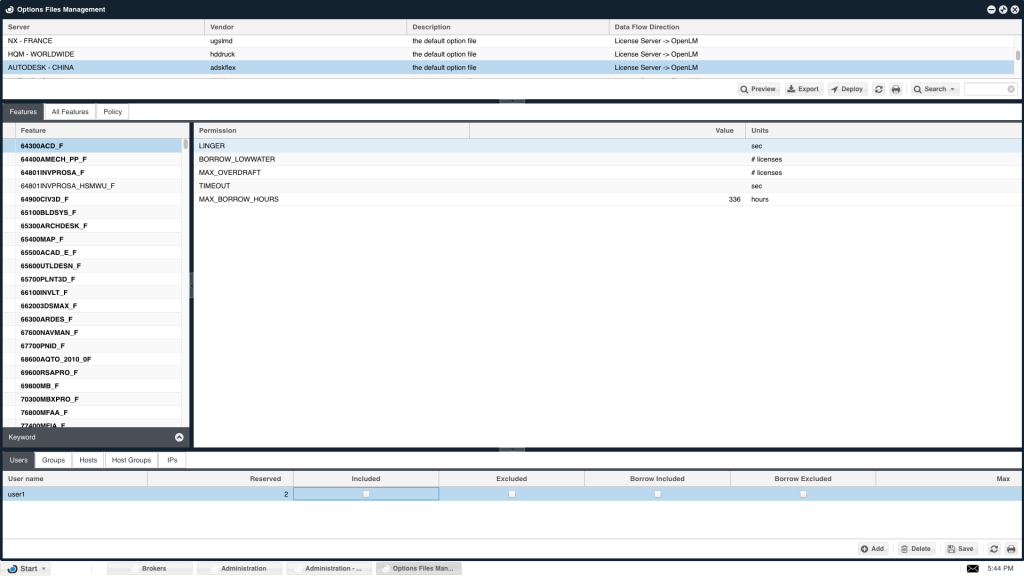 FLEXlm(FlexNet Publisher)のオプションファイルで、ライセンス管理者はライセンスモデルの制約をさまざまな動作パラメータで厳密に制御することが出来ます。ライセンスされたフィーチャーは、オプションファイルの設定に従って、ユーザーまたはユーザーのグループ、ホスト、IPやホストグループに対して専用、拒否、予約できます。