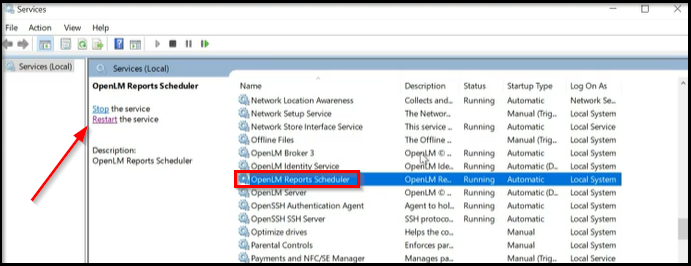 Reports Schedulerを再起動するには、 [サービス]→[OpenLM Reports Scheduler] を選択し、 [再起動] をクリックして サービスを再起動します。